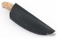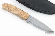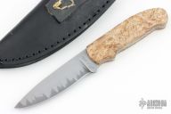 This knife by Dave Armour features a San Mai Damascus blade (A203e Stainless Steel and a 5160 core), .161" blade stock and 1.101" blade depth, full tang construction. The handle has stabilized Ambonya Burl wood grip. Comes with a black leather sheath. New from maker. #38 of 40