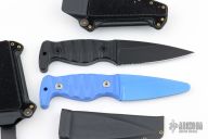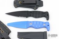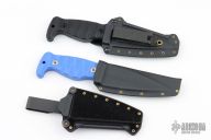 Has a black stonewashed blade with .160" blade stock and 1.208" blade depth, full tang construction with black G-10 scales. Comes with an ambidextrous kydex sheath with velcro loops on one side and a metal clip on the other. The sheath also holds a fire steel in the sheath. Comes with matching trainer. Comes with an additional kydex sheath. Excellent condition.