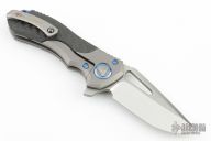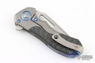 This Protocol Flipper by Marfione Custom Knives features a mirror polish blade with notched thumbrest and flipper. The handle has a stonewashed titanium frame with carbon fiber scales, blue anodized titanium backspacer and hardware, tip up bead blasted titanium clip with ceramic ball and hidden screws. Nice detent, lockup and blade seating. Comes with original box and papers.  #006 and dated 06/2019. Excellent condition.