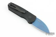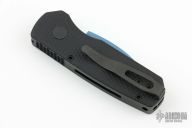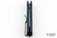 This Runt by Pro-Tech features a sapphire blue Magnacut blade.  The handle features a textured black aluminum frame with milled thumbrest, a black stainless steel tip up pocket clip with an abalone inlaid push button. Comes with original box and papers. Excellent condition.