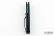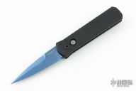 This Godson by Pro-Tech features a satin sapphire blue finished blade with false top edge. The handle has a black aluminum handle with black tip up stainless steel clip.  Abalone inaid push button. Includes the original box and papers. Excellent condition.