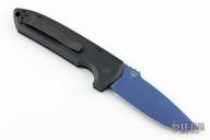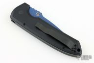 This Rockeye Auto Operator by Pro-Tech has a sapphire blue blade with notched thumbrest. The handle has a black textured aluminum frame with a matching steel tip up pocket clip. Pearl inlaid push button. Typical flawless Pro-tech mechanics and blade seating. Comes with original box and papers. Excellent Condition.