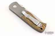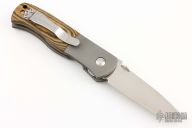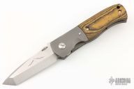 This Custom CQC-7 by Emerson Knives features a chisel ground satin finished tanto blade with notched thumbrest, non-waved, and a thumbdisc. The handle has bead blasted and dovetailed titanium bolsters, Maple Richlite scales, bead blasted titanium liners, black G-10 backspacer, tip up stainless steel clip. Comes with original box. New from the Nashville Custom Knife Show.