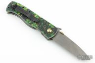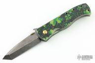 This CQC-7 by Emerson Knives has a black Thunderstorm finished chisel ground blade with notched thumbrest, wave features and anodized titanium thumbdisc. Has "Gold Dust w/ Bling" G-10 scales, titanium liners, and a tip up black stainless clip. S/N 0344. Nice detent, lockup and blade seating. Includes original box and papers. New condition.