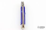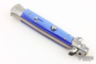 This Swivel Bolster by Frank Beltrame features a polished flat ground blade. The handle has stainless steel bolsters, front and rear, blue pearlex scales, brass liners, stainless spring. Excellent condition.