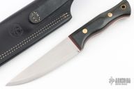 This Tradesman from Adventure Sworn features a satin finished scandi ground blade with .123” blade stock and 1.332” blade depth, full tang construction. The handle has black canvas micarta scales with red linen micarta liners and brass pins and lanyard hole. Comes with a black leather sheath and a zippered case. Comes with original papers. Has some light staining on the blade, otherwise excellent condition. Unused.