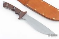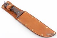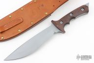 This Combat Bowie has a 7.75" blade made from the very best . 250 thick 01 tool steel vacuum heat treated to perfection at 57/58 Rc, 1.770" blade depth. The full tang handle has brown linen micarta scales with an extended tang at the butt and lanyard hole. Perfect knife for long range hunting in the wilderness and always a sure bet for a true collectible. Comes with a brown leather sheath by Mosher. Excellent condition. Comes with additional set of black/brown G-10 scales.