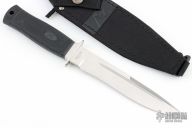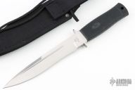 This Alley Kat fixed blade by Katz Knives features a satin finish blade with false top edge and fullers, .195" blade stock, 1.085" blade depth. Hidden tang construction with stainless steel guard and rubber handle. Includes nylon sheath. Excellent condition. Blade Steel: XT-70 Stainless Steel