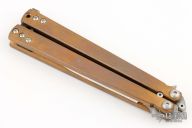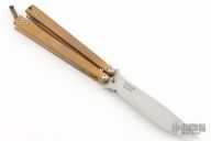This balisong by Valhalla Cutlery features a satin finished chisel ground blade. The handles are brass with a T-latch. Has a couple scratches, otherwise good condition for its age. Comes with a zippered case.