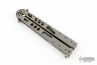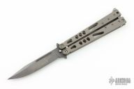 This Tachyon balisong by Microtech has a black tumbled blade and skeletonized bead blast titanium handles. #0842 and dated 02/2002. Comes with original box, sheath and papers. Has a few scuffs, otherwise excellent condition.