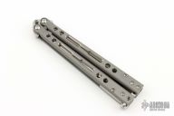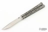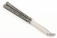 This Specter Balisong from Jerry Hom features a satin finish recurve blade with swedge. The handle is comprised of bead blasted and skeletonized titanium handles with satin titanium backspacers and T latch. Includes original box and paperwork. Has a couple light scratches, otherwise excellent condition.