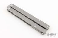 This Scorpius Balisong by Maxace features a stonewashed blade. The handle has bead blasted titanium scales, spacers and t-latch. Has scuffs, otherwise good condition. Comes with zippered case, trainer blade and extra hardware.