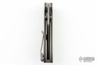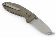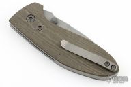 This Alpha by Tom Krein features an acid finished drop point blade with dual thumbstuds and a false top edge. The handle has Green Linen Micarta scales, tumbled titanium liners and tip up clip, titanium backspacer. Nice lock up, detent and blade seating. Includes a zippered case. Excellent condition.