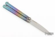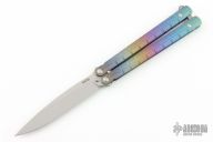 This knife features a bead blasted drop point blade. The handle has a milled and anodized titanium frame with a bead blasted T-latch. Includes a bead blasted trainer blade, the original box, papers and extra hardware. Excllent Condition.