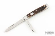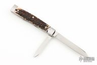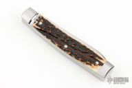 This Serpentine English Jack by Ryuichi Kawamura features 2 satin finished blades with nail nicks, all have halfstops and flush in all positions. The handle has fluted stainless steel bolsters and cap, stag covers with stainless shield escutcheon, stainless steel liners and springs. Has a nice snap. Includes a padded zippered case.  Excellent Condition.