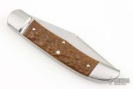This Pocket Hunter by Jerry Halfrich features a hand rub satin finished blade with nail nick. The handle has satin stainless fluted bolsters with integral liners, stainless steel spring, butterscotch jigged bone covers. Half stop on blade, flush in all positions. Excellent fit and finish. Comes with zippered case. Excellent condition.