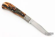 This slipjoint from Mastersmith Steve Dunn features a hand rub satin finished blade with nail nick. The handle has engraved stainless steel bolsters with gold inlays, stag covers, stainless steel liners and spring. Has half-stop. Comes with a zippered case. Has a few light scratches, otherwise excellent condition.