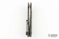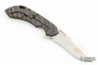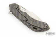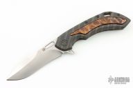 This Wayfarer 247H from Olamic Cutlery features a satin finished harpoon blade with swedge, thumb hole, notched thumbrest and flipper. The handle scales are flame finished titanium with matching pocket clip is positioned for tip up carry, floating flamed titanium backspacer. The handle has a sculpted copper inlay. The Wayfarer 247 is very comfortable in the hand and flips well with no wrist action needed. Blade is centered when closed and locks up with no play. Comes with zippered case and maker's card with a serial number of T693H. Has scuffs on the frame, otherwise good condition.