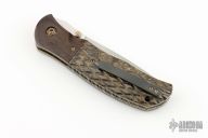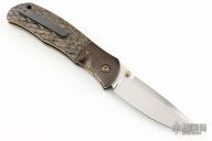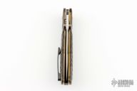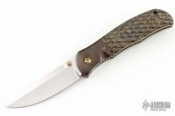 This Linerlock by John W Smith features a spear point hand rub satin finished blade with dual thumbstuds and notched thumbrest. The handle has dovetailed black/copper crazy micarta bolsters, anodized titanium liners, zirconium tip up clip, hand checkered gold dark matter carbon fiber scales and fileworked backspacer. Nice detent, lockup, and blade seating. Excellent condition. Comes with a zippered case.