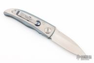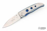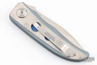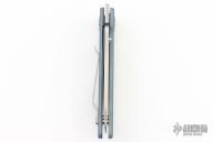 This Michael Walker designed Sarra-C liner lock by Klotzli features a satin/blasted titanium frame with a single anodized titanium liner and a tip up reversible stainless steel clip. Satin finished ATS-34 blade drop point blade with single thumb stud and notched thumbrest. Nice lockup, detent and blade seating. Excellent condition.