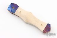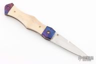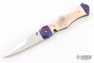 This linerlock folder by Harold Moeller features a satin finished blade with single thumbstud with ruby inlay. The handle has purple Damascus bolsters, walrus ivory scales, fileworked stainless steel liners and backspacer. Nice detent, lockup and blade seating. Excellent condition.