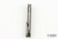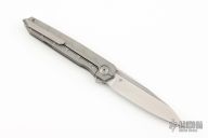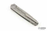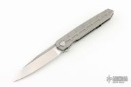 This Cypher Mini Bright by Deryk Munroe features a tumble finished blade with fullers, a notched thumbrest and flipper. The handle has a tumbled titanium frame, a matching titanium backspacer with lanyard hole, titanium tip up clip with hidden screws, and stainless steel lockface insert/internal over travel stop. Nice detent, lockup and blade seating. Rides on caged ceramic Si3N4 bearings. Comes with original packaging and COA. Excellent condition.