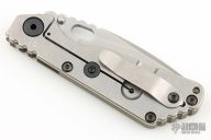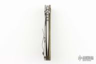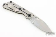 This Mick Strider SNG framelock folder features a stonewashed blade with thumbhole and notched thumbrest. The handle has a green G-10 and stonewashed titanium frame with titanium clip, tip up carry. Jimping on blade spine. The G-10 has a cross-hatch pattern. Nice lockup, detent, and blade seating. Excellent condition.