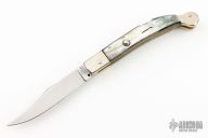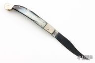 This Sahara lockback auto by AGA Campolin features a polished blade, nickle silver bolster and buffalo horn scales, brass liners. Nice function, strong firing and lock up. Has a few light scratches, otherwise excellent condition. They no longer make this knife. Comes with a leather slip sheath and COA dated June 5th, 2017