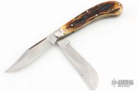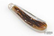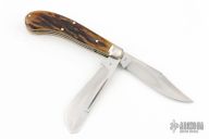 This Saddlehorn Trapper by Tony Bose features two hand rub satin finish blades with nail nicks, fluted and polished nickel silver bolsters, and stag covers, nickel silver liners and stainless steel springs. Half stops on blades, flush in all positions. Has a couple very light scratches, otherwise excellent condition. This one is #4. We sold this knife once before in 2006, so its older than that. Comes with a velcro case.
