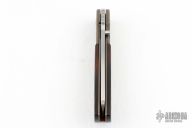 This TTF-6 by Bob Terzuola features a tumble finished blade with single thumbstud. The handle has anodized and bead blasted titanium bolsters, desert ironwood burl scales, anodized and bead blasteed titanium liners, red canvas micarta backspacer. Nice detent, lockup and blade seating. Has some scuffs and scratches, otherwise good condition. Comes with a velcro case.
