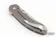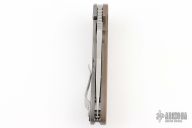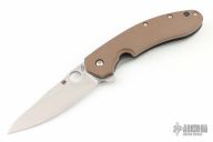 This Southard frame-lock flipper by Spyderco Knives features a stonewashed blade with a notched thumb-rest, thumb-hole, and flipper. The handle has a textured brown G-10 scale with a stonewashed titanium liner and titanium scale with brown G-10 around the pivot screw and a stainless steel clip, tip up carry. Excellent condition. Comes with original box and papers.