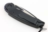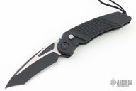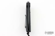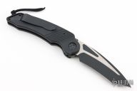 This MRX by Rat Worx features a black tanto recurve blade with satin flats. The handle is black aluminum with a chain drive opening mechanism. Tip up blasted stainless clip. Excellent condition. Comes with original box.