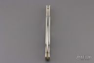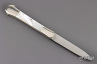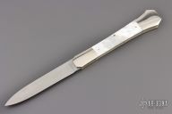 This lockback folder by Mel Pardue features a hand rub satin finished blade. The handle has nickel silver bolsters, front and rear, mother of pearl scales, nickel silver liners, stainless steel backspacer. Nice lockup and blade seating. #002 on blade. Has a few light scratches, otherwise excellent condition.
