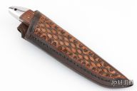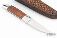 This Integral hunter by George Trout features a mirror finished blade with .133" blade stock and .920" blade depth at the ricasso, full tang. The handle has an integral guard and pommel with Ringed Gidgee wood scales and stainless pins, lanyard hole at the butt. Comes with a hand tooled brown leather sheath. Excellent condition.