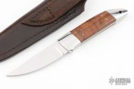 "I started making knives in 1985. I use the stock removal method. I also discovered the wonderful world of forged knives, I also started making full integrals using a milling machine. I usually have all three types at the shows I attend and I use most common steels. I do my own heat treating and like to use handle materials like stag, ivory, wood, micarta, sheep horn, and others. I make my own sheaths individually for each knife."