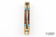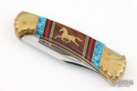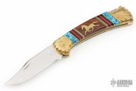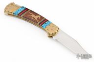 This Buck Model 112 has been customized by David Yellowhorse. The blade features a mirror polished clip point blade with a single nail nick. The handle features a carved brass frame with multi piece inlays. Includes wood, felt lined display box with brass plaque. Excellent condition.