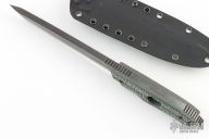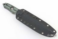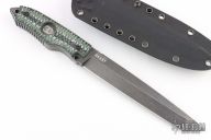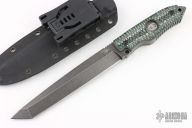 This ERT by Brian Hoffner features a black tumble finished blade with notched thumbrest, .358" blade stock and 1.128" blade depth, full tang construction with G-10 scales. Comes with sheath. Excellent condition.