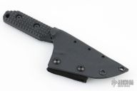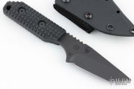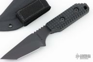 This knife by Strider Knives features a black coated tanto style blade with notched thumbrest, .201" blade stock and 1.299" blade depth, full tang construction. The handle has a black G-10 scales with MEFP. Lanyard hole in pommel. Includes kydex sheath. Has a couple light scuffs, otherwise excellent condition.