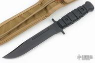 Chuck Mawhinney is a Marine Sniper that has the record for the most confirmed kills by a USMC sniper. This model is the Chuck Mawhinney Fighting Knife. Obviously, there is a heavy K Bar influence in keeping with Mr. Mawhinney's Marine background. The K Bar is one of the most recognizable knives in the world. Unfortunatly, the ones issued to troops are not up to Strider standards. The CMFK fixes that with a full length tang design that is made from super tough CPM 3V steel. The handle scales are stepped black G10 scales that provide excellent grip. Made from super tough CPM 3V steel, and unlike the issued knife, you can actually use and abuse this one without snapping the tip off the first day in the field! Comes with a CSM sheath. Has some light scuffs, otherwise excellent condition.