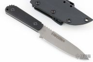 This Tricon Fixed Blade from Strider Knives features a bead blast finish drop point blade with notched thumbrest. .163" Blade Stock. 1.037" Blade Depth. The handle is comprised of black G10 scales with lanyard hole over full tang construction. Includes kydex sheath. Has a couple light scuffs and scratches, excellent condition otherwise.