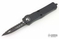 The Troodon by Microtech Knives features a double- edge two-tone blade with full serrations.  The handle has a black aluminum frame with a black tip down steel pocket clip.  Has some light scuffs on the pocket clip otherwise the knife is in excellent condition.