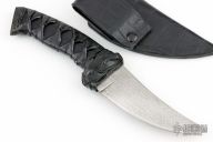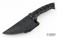 This knife by ITAC features a Raindrop Damascus blade with.174" blade stock and 1.390" blade depth, hidden tang construction with leather wrapped handle. Comes with a leather covered kydex sheath and a zippered case. Excellent condition.