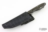 This knife by On Point Knives (Larry C. Mensch and Craig B. Hulet) features a hand rub satin finished blade with notched thumbrest, .165" blade stock and 1.205" blade depth, full tang construction with black linen micarta scales. Comes with a black leather covered kydex sheath and a nylon zippered case. Excellent condition.