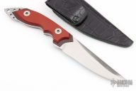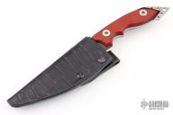 This knife by ITAC features a hand rub satin finished blade with false top edge and a notched thumbrest, .169" blade stock and 1.259" blade depth, full tang construction with red paper micarta scales with black liners. Comes with a leather covered kydex sheath and zippered case. Has some light scratches, otherwise excellent condition.