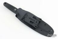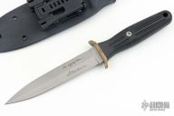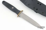 This Applegate-Fairbairn Combat Dagger (#18950) has a bead blasted 440C stainless steel DE spear point blade with hidden tang. Blade stock is 3/16", depth is 1-1/16". Handle is non-slip black polymer with contoured grooves, bead blasted brass guard, and lanyard hole. Comes with a kydex sheath. Has some light scuffs and patina, otherwise excellent condition.