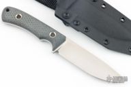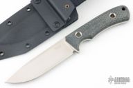This SouthPole fixed blade from TRC Knives has a satin finished drop point blade with notched thumbrest, .175" blade stock, 1.207" depth. Handle is comprised of checkered black canvas micarta with lanyard hole over full tang construction. Includes kydex sheath with belt loop, original box and papers. Excellent condition.
