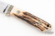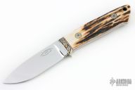 The classic Drop Point Hunter that made Bob Loveless designs so famous. Mirror finished drop point blade with the "R.W. Loveless maker Riverside, Calif." logo. Full tapered tang construction. .182" Blade Stock 1.044" Blade Depth. The handle has a nickle silver guard and stag scales with red liners, lanyard hole. #252. Comes with matching numbered leather sheath. Engraved bolsters, and pins. Engraved by Jere Davidson. Has some very fine scratches, excellent condition otherwise.