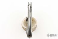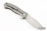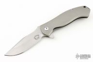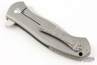 These Deluge flippers are a designed by D.B. Fraley and produced by Reate Knives. The hand ground blades feature a hand rubbed, satin finish. The handle is crafted from bead blasted titanium. The backspacer and pocket clip are also titanium and feature Fraley's "Lost Souls" pattern. Pocket clip is positioned for tip up carry. Blades are centered when closed, knives flip well with no wrist action needed, and have nice crisp detent. Comes with an Artisan Cutlery zipper pouch. Has scuffs, and scratches good condition otherwise.