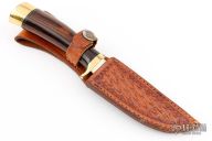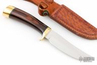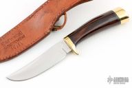 This knife by Browning Knives features a polished blade with .108" blade stock and .944" blade depth, hidden tang construction. The handle has a brass guard and butt, dymondwood grip with black/grey spacers. Comes with a hand tooled brown leather sheath. Has some light scratches, otherwise excellent condition.