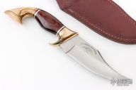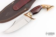 This Stinger Bowie from Iron Mountain Knife Company features a satin finished blade with false top edge, .185" blade stock, 1.655" blade depth, hidden tang construction. The handle has a brass guard and butt, a dymondwood grip black and aluminum spacers handle. This design - which allows you to retain the knife with your hand open/fingers splayed - was patented by Sonny Guiler in 1980 and the knife has the patent number stamped on the blade. Excellent condition. Includes brown leather sheath with belt loop.